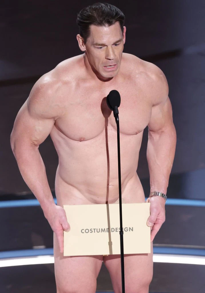 Kimmel eventually convinced the DC star to walk out onto the stage, and the audience was treated to Cena's physique in full view, with nothing except a large envelope covering his manhood.