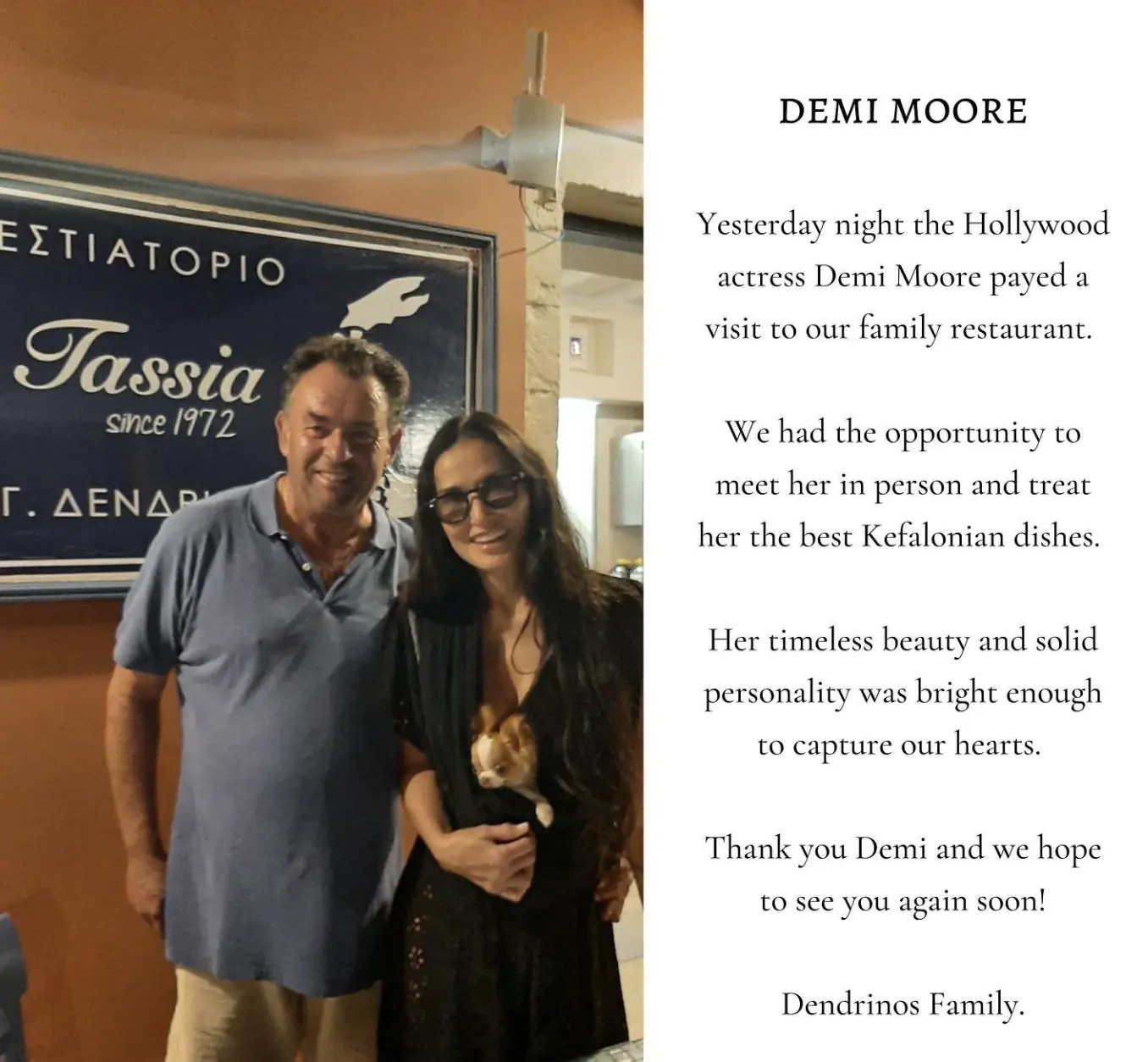 In the caption, they wrote: “An inspiring guest, and one of the most influential women of her generation. She experienced a taste of our Greek hospitality and cuisine. It was a true pleasure to host such a remarkable guest. We hope to welcome her again soon! – Dendrinos Family.”