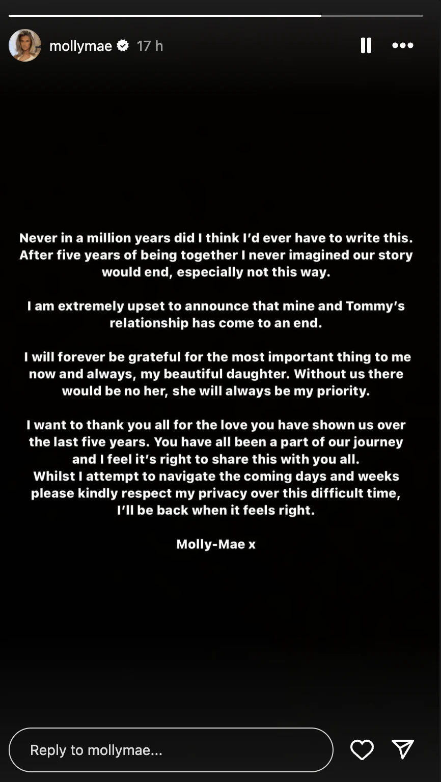 "Never in a million years did I ever think I'd have to write this," she started. "After five years of being together I never imagined our story would end, especially not this way. I am extremely upset to announce that mine and Tommy's relationship has come to an end.
