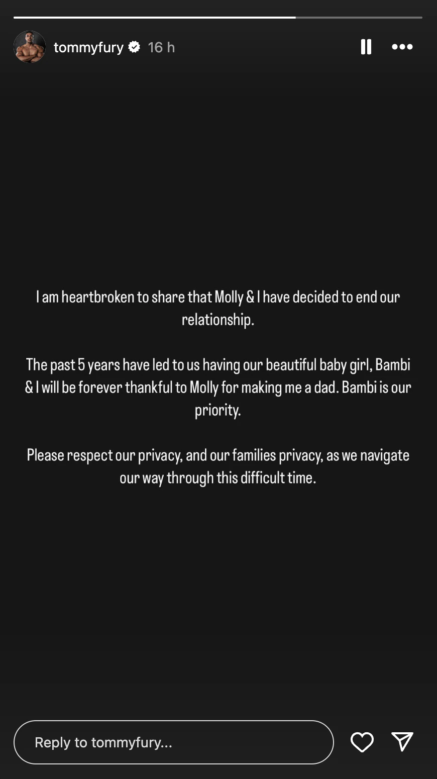 Just moments later, Fury also took to his own Instagram account to release a statement of his own, telling his fans he was "heartbroken."