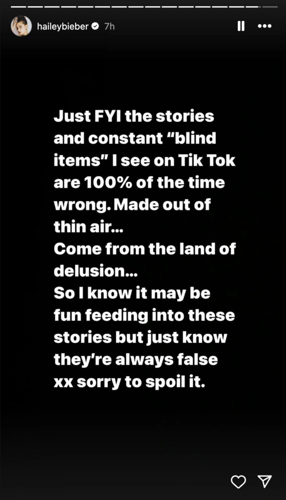 "Just FYI the stories and constant 'blind items' I see on TikTok are 100% of the time wrong. Made out of thin air... come from the land of delusion," she wrote in the post.