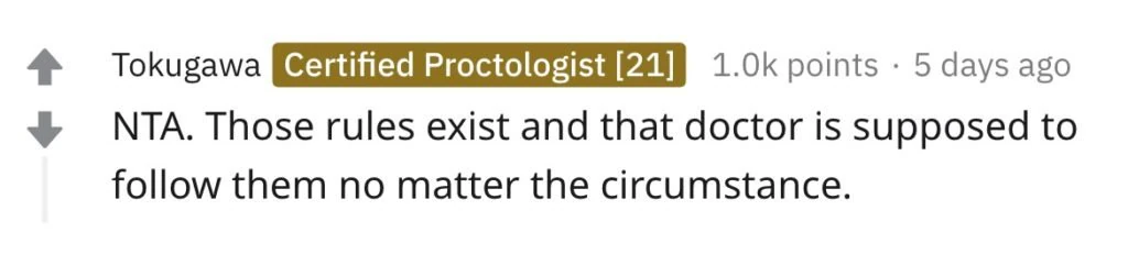 Another added: "NTA. Those rules exist and that doctor is supposed to follow them no matter the circumstance."