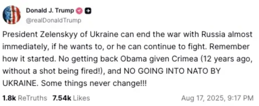 “President Zelenskyy of Ukraine can end the war with Russia almost immediately, if he wants to, or he can continue to fight,” Trump wrote in a late-night Truth Social post. “Remember how it started. No getting back Obama-given Crimea (12 years ago, without a shot being fired!), and NO GOING INTO NATO BY UKRAINE. Some things never change!!!”