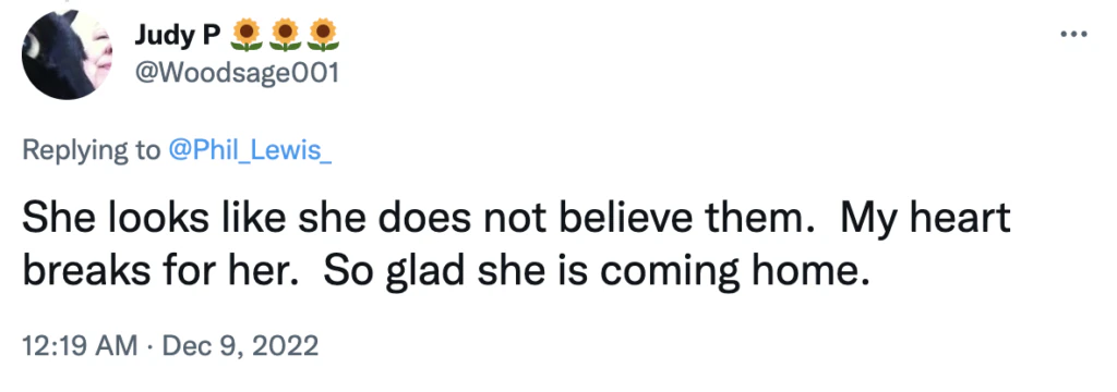 "She looks like she does not believe them. My heart breaks for her. So glad she is coming home," wrote one user.