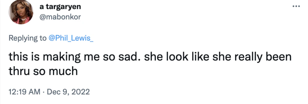 "This is making me so sad. She look like she really been thru so much" (sic), another added.