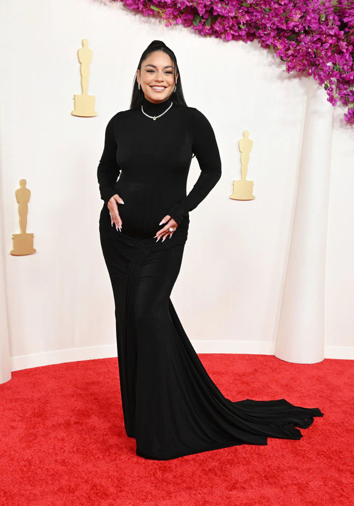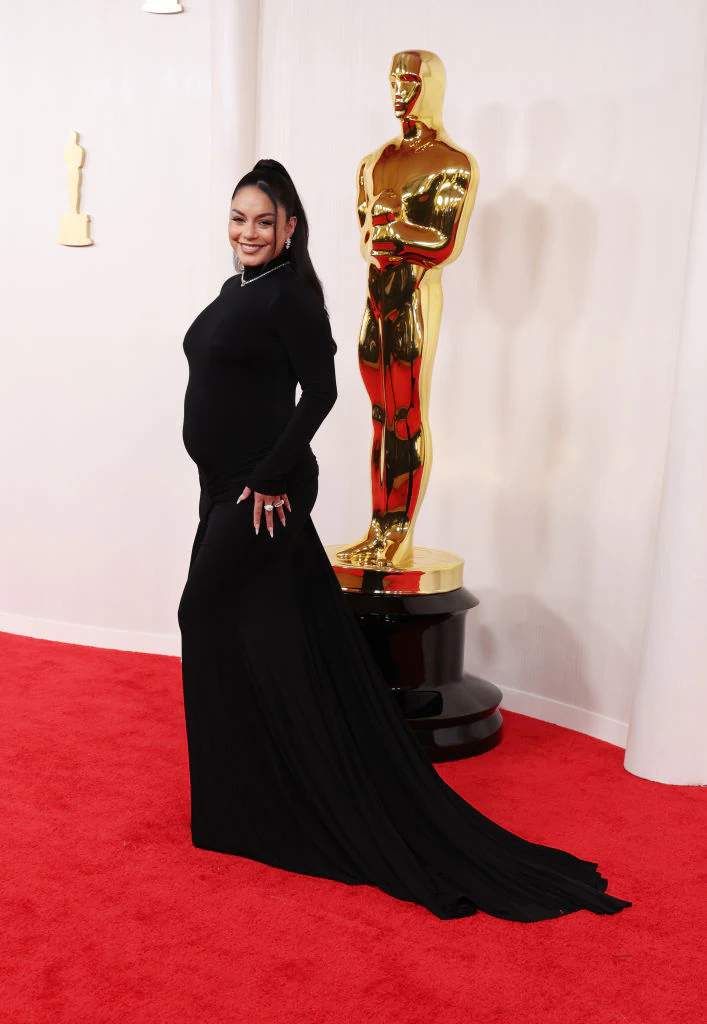 Hudgens set tongues wagging and cameras flashing as she proudly flaunted her burgeoning baby bump in a stunning black gown, as she prepares to welcome her first child with husband Cole Tucker.